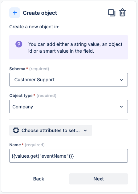 Finally, everything is ready for the Create Object Automation action. Unfortunately, the Create Object action does not have a dedicated page in the Atlassian documentation. However, it can be found by searching for "create object". Select the appropriate Asset Schema, Object Type, and Attributes from the dropdowns. In this screenshot, you can see why creating the Lookup Table makes this part of the process easier to read.